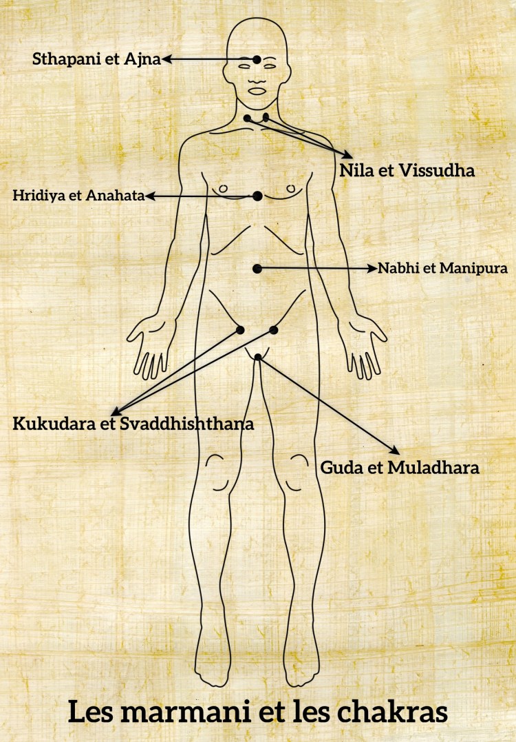 Là où les Nādī (canaux énergétiques) et les Chakras (vortex énergétiques) furent découverts par les sages en recherche de l’éveil spirituel ; ce sont les praticiens des arts martiaux tel que Kalaripayattu, Vajra Mushti et Dhanurveda (l’art de l’arc) qui découvriront l’existence des points de Marma. Durant le combat, ils se sont rendus compte que toucher certains points sur le corps humain pouvaient tuer les combattants. D’où le mot Marma, qui vient de racine Mar, qui veut dire : Tuer.