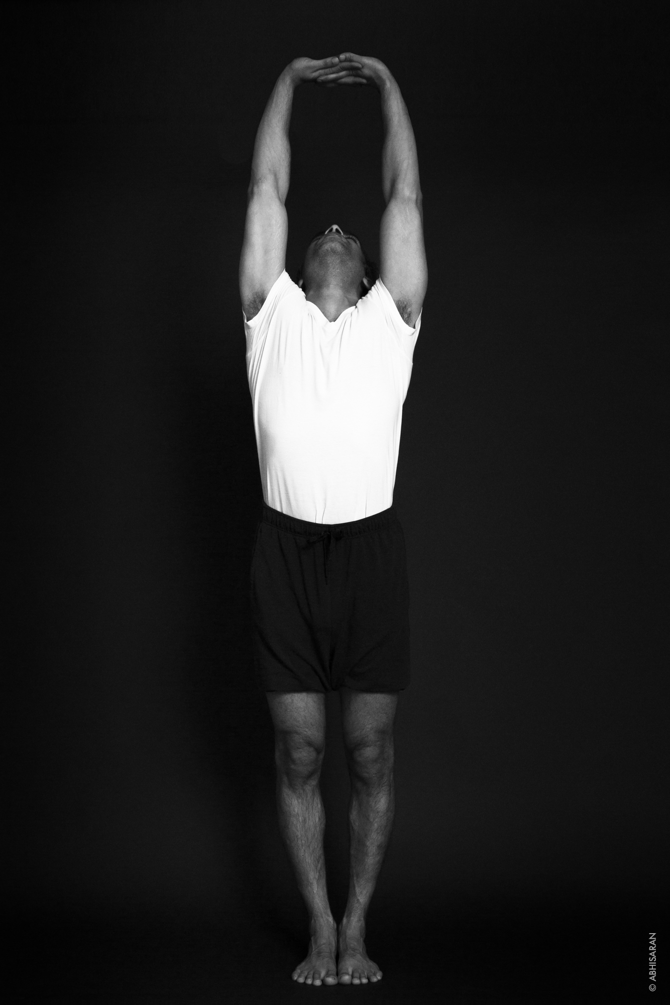 Inspirez et soulevez vos mains vers le toit. Laissez votre cage thoracique descendre vers le sol. Restez pendant 5 souffles.