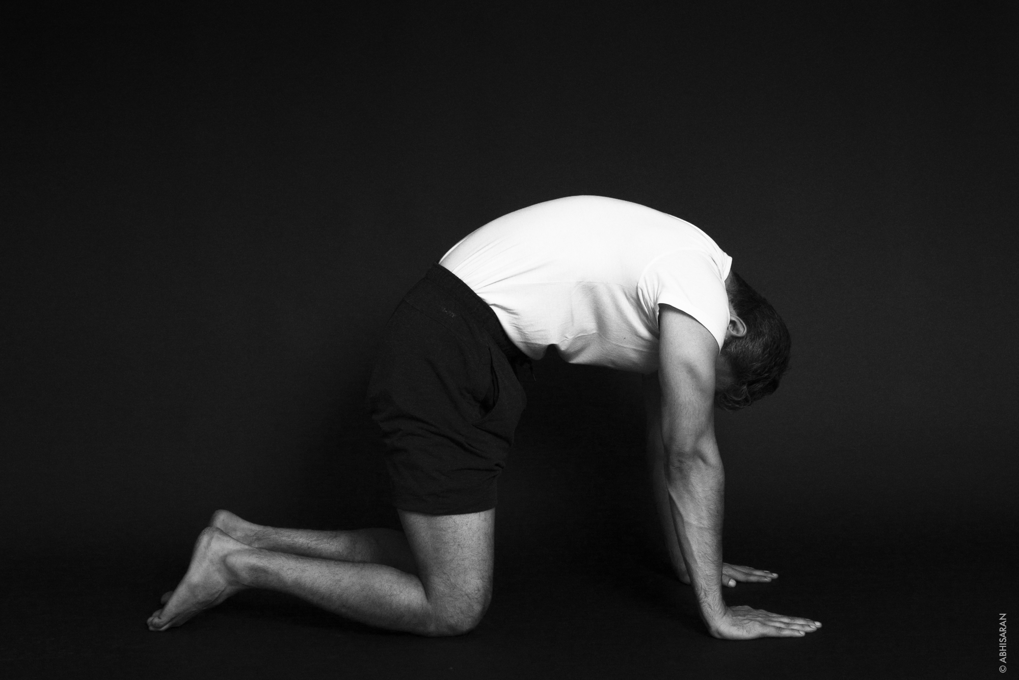 Expirez et arrondissez votre dos. Pratiquez un vinyasa avec bitilasana durant 10 souffles avant d’aller dans Adho mukh svanasana.