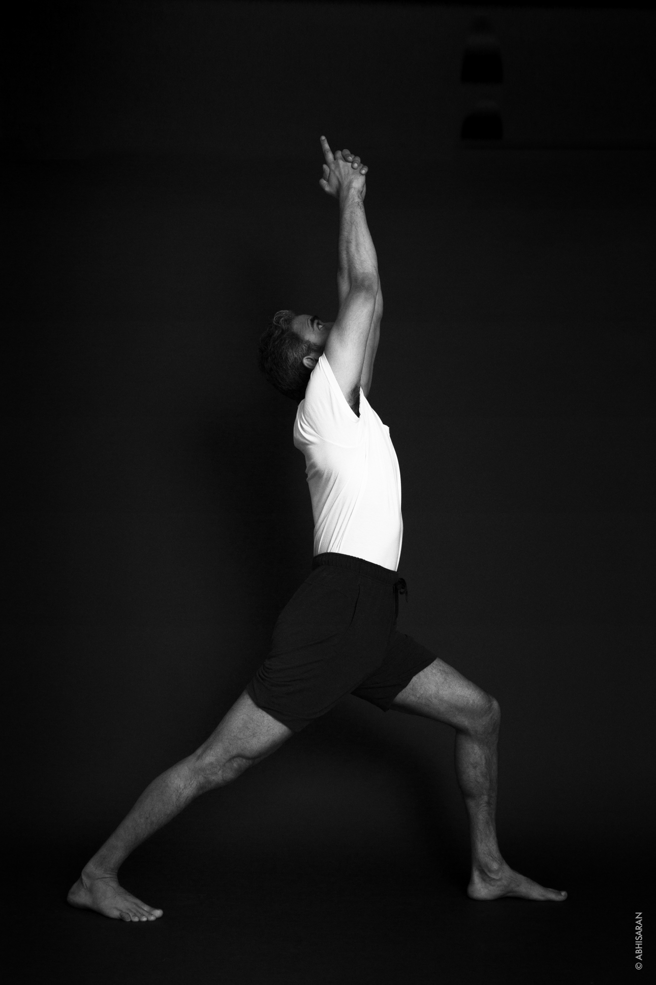 De Tadasana, écartez vos jambes. Tournez le pied gauche vers l’extérieur à 90°. Tournez le pied droit vers l’intérieur à 45°. Expirez et tournez vous vers votre genoux gauche en pliant celui-ci. Inspirez et soulevez vos mains. Restez 5 souffles avant de revenir. Faites de même sur la coté droite.