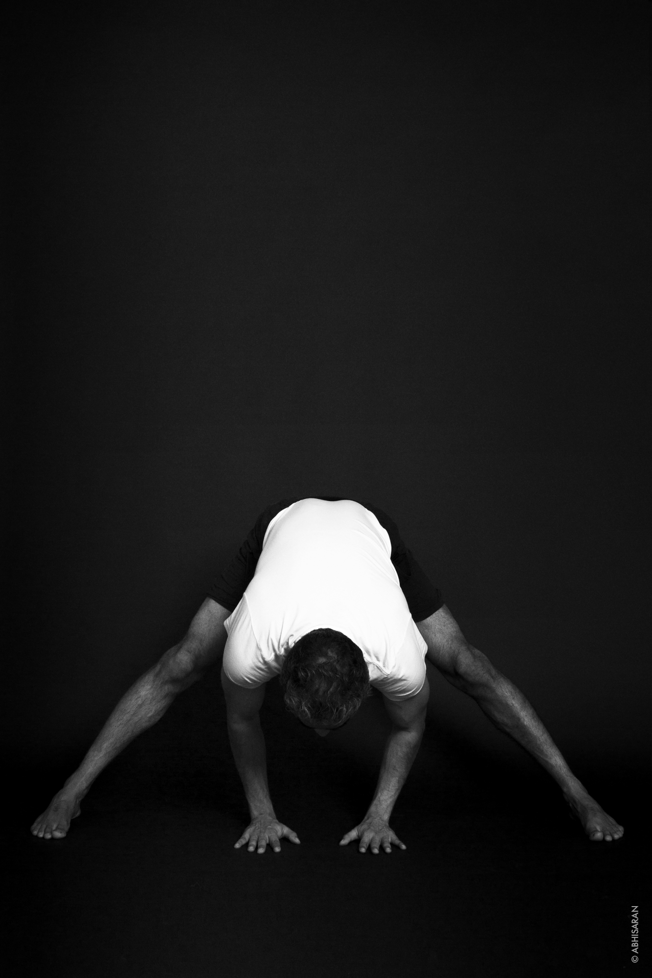 Expirez et pliez vous des hanches. Gardez votre dos droit. Essayez de ralentir le rythme de votre respiration. Inspirez, revenez.